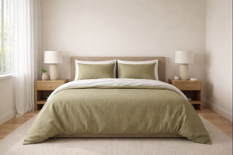 The Sage Retreat creates a welcoming fell with white base sheets and a bed topped in the soft sage tone.